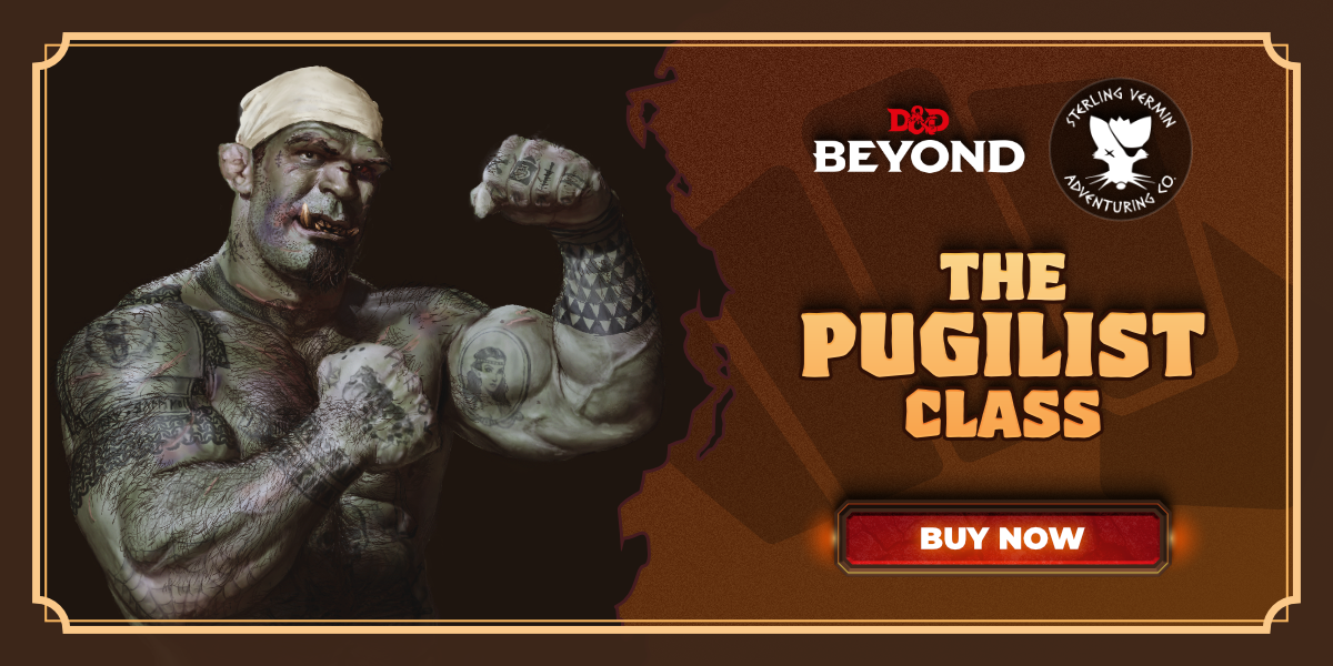 If you’re a long time fan of the Sterling Vermin Adventuring Co. you know doubt know of the Pugilist class. We’re over the moon to announce a new version of the class for 5.5e is now available on DnDBeyond! Click the image below to get your copy now.
